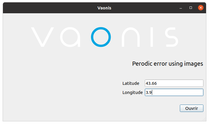 J’ai tout d’abord mis en place la page de lancement de l’application. Cette fenêtre portant les couleurs de Vaonis dispose de deux champs qu’il faut renseigner de la longitude et la latitude où ont été prises les photos. Puis, en cliquant sur le bouton « ouvrir », l’explorateur se lance afin d’aller chercher l’ensemble de la série de photo dont l’on souhaite connaitre l’erreur périodique.