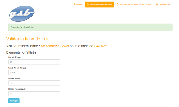 - Soit corriger les éléments forfaitisés en cliquant sur le bouton « corriger », un bandeau l’informe du bon déroulement de l’opération