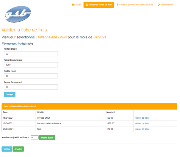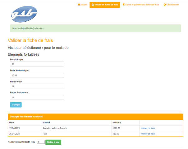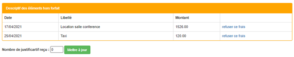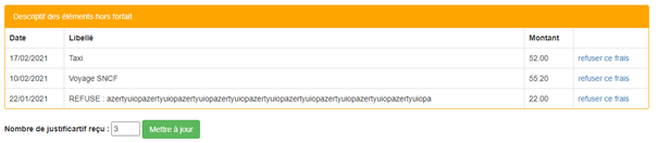 Si le comptable valide le refus, le frais est retiré du tableau (reporté au mois suivant) et les informations de rais hors forfait sont mises automatiquement à jour.