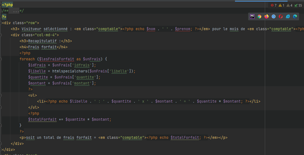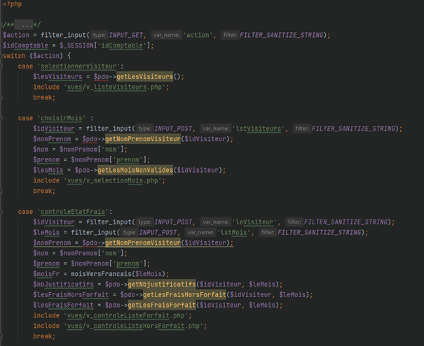 A chaque fois, le contrôleur récupère l’identifiant du visiteur et le mois de la fiche de frais. Voici la suite des actions gérés par le contrôleur.