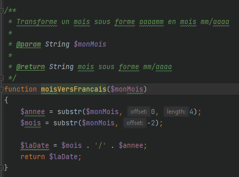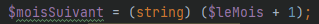 Ici, j’ai recours au transtypage. Comme j’additionne « 1 » au mois, PHP convertit implicitement la variable « mois » en nombre. Or pour la fonction (fournie) EstPremierFraisMois, j’ai besoin d’une chaîne et non d’un nombre.