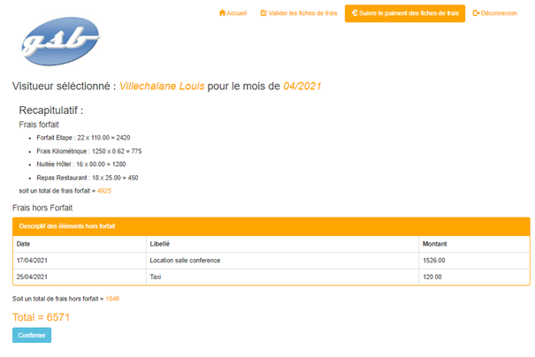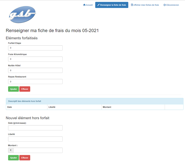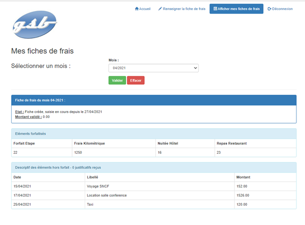 Une fois le mois et le visiteur choisi, le contrôleur modifie la vue et lui envoie les informations des frais forfait et de frais hors forfait.