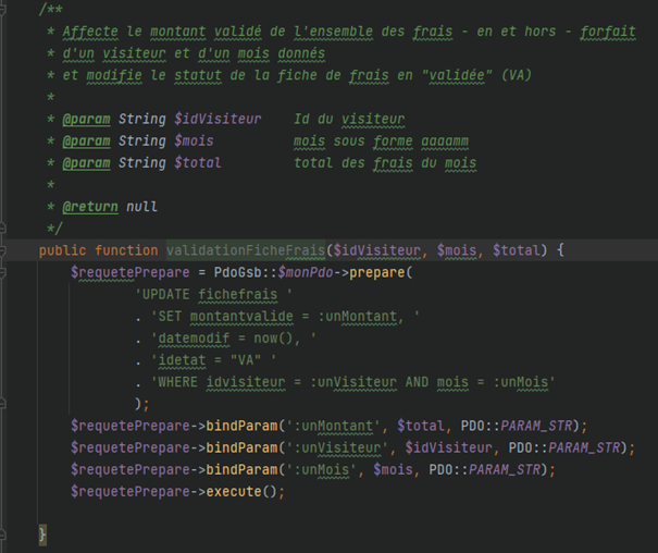 Pour valider la fiche de frais, le contrôleur demande au modèle, la classe PDO, de faire les modifications dans la base de données. Notre fiche est passée de l’état clôturée (CL) à l’état validée (VA).