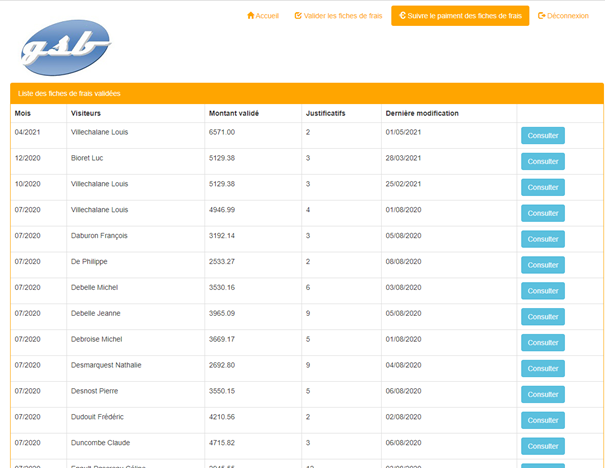 Dans notre exemple pour le contrôle des frais, nous avons validé la fiche du mois d’avril du visiteur Villechalane. Nous la retrouvons dans un tableau regroupant toutes les fiches se trouvant dans l’état « validé » (VA). J’ai choisi de classer le tableau par ordre de date décroissant. Le bouton « consulter » permet de choisir la fiche de frais voulue.