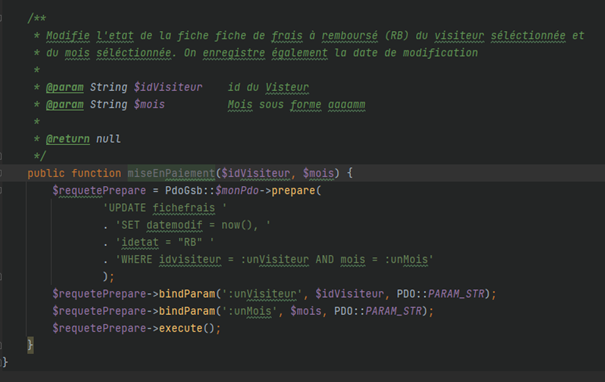 Il est stipulé dans le cahier des charges que lors d’un refus de frais hors forfait, il faut ajouter au libellé : « refusé » et limiter sa longueur à 100 caractères. Voici la fonction « refuserFrais » du contrôleur c_validerFicheFrais.