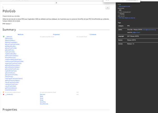 A l’aide phpDocumentor que j’ai installé sur mon serveur et avec l’aide des commentaires, j’ai pu générer la documentation des fonctions et des classes que j’ai écrites. La documentation gérée se trouve à l’adresse suivante : https://site-en-vrac.com/gsb/doc/
