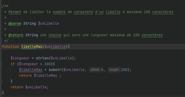 J’ai créé une fonction « libelleMax » qui se charge de vérifier et de couper le libellé à 100 caractères en partant de la fin.
