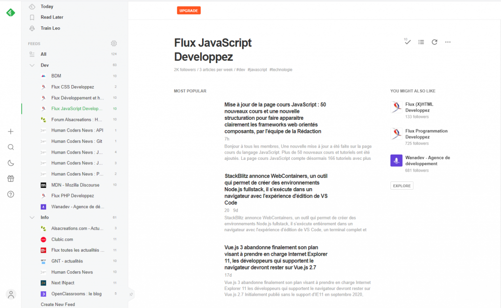 J’organise ma veille grâce au site d’agrégation feedly.com, essentiellement pour les différents langages de développement.